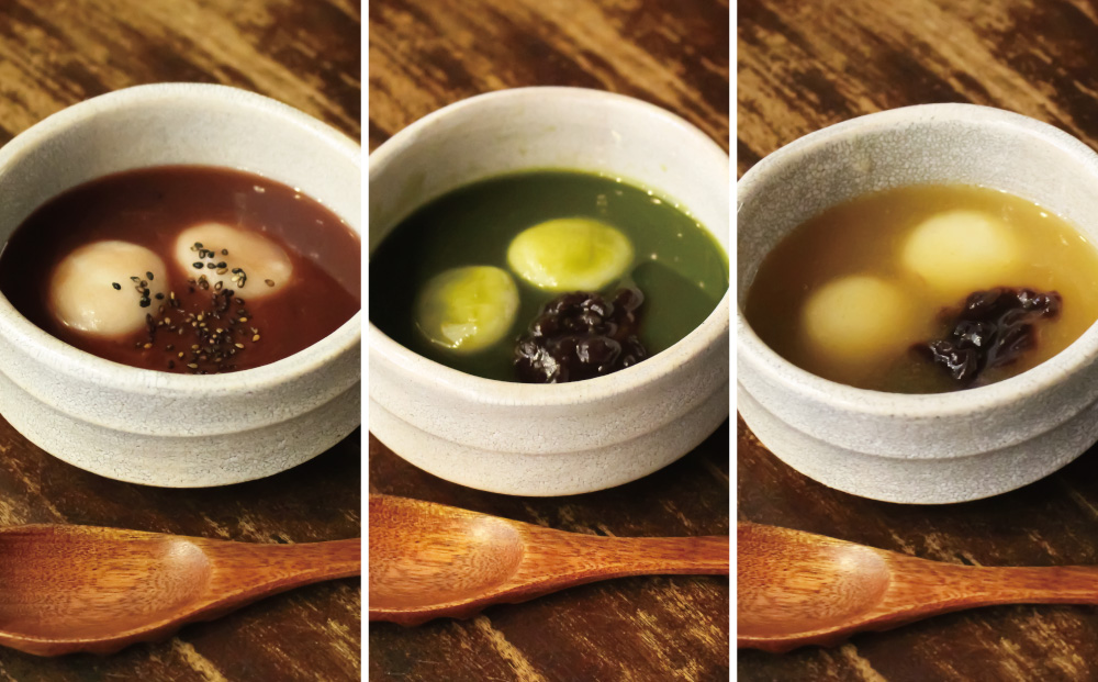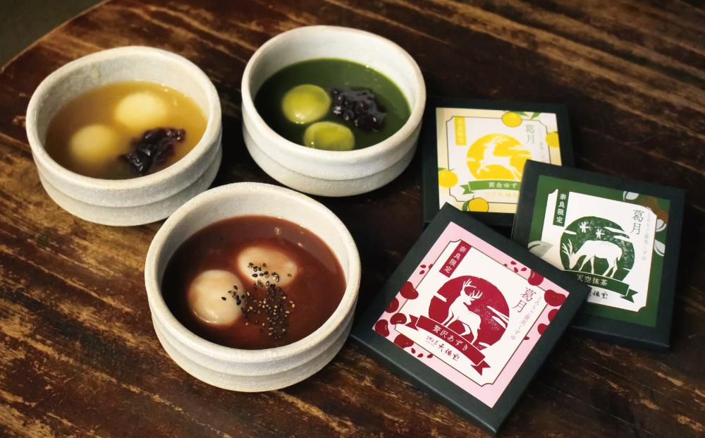 葛湯と言えば小腹がすいたときに飲む温かい飲み物というのが一般的なイメージですが、葛月はこれ一つでスイーツとして完成されたものにしようと考えて作りました。そのため、「贅沢あずき」にはまる餅とごま塩、「天空抹茶」®と「黄金ゆず」にはまる餅と粒あんがセットになっています。