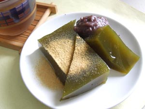 抹茶の香り豊かな葛餅です。ほろ苦い抹茶に、甘く炊き上げた小豆をからめてどうぞ。