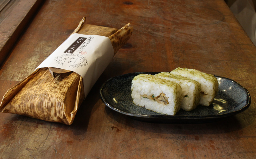 山椒の実の辛味が絶妙なあなご大葉の絹巻時雨寿司を竹の皮で包みました。